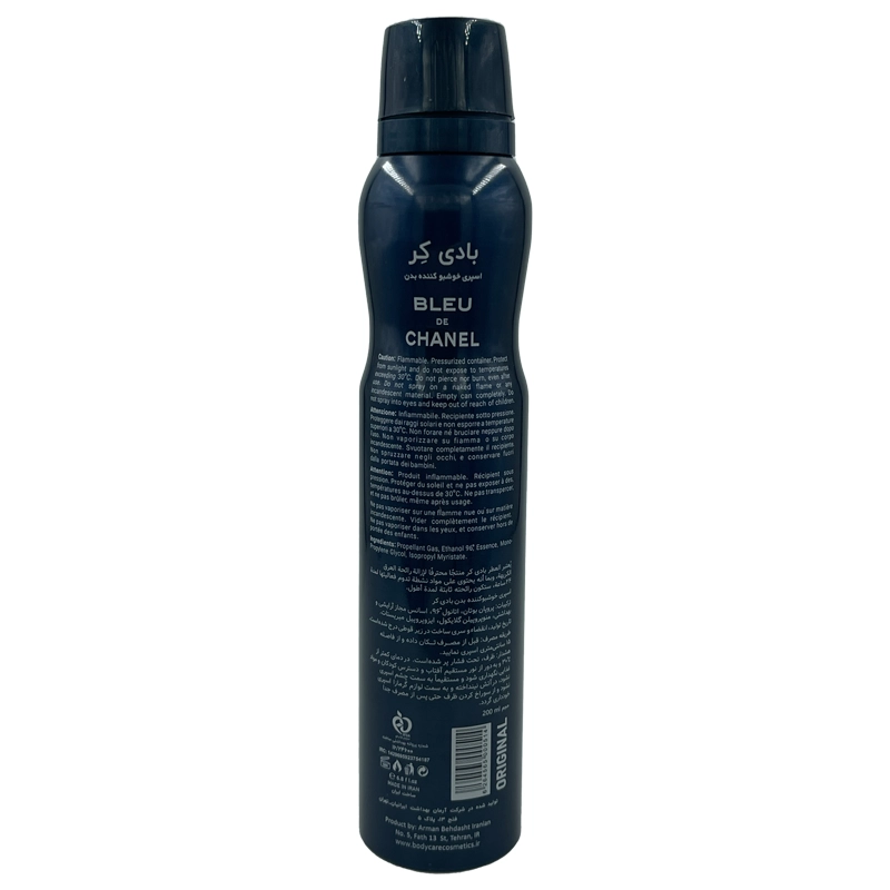 اسپری بدن مردانه بلو د چنل بادی کر ۲۰۰ میلی لیتر شامل ترکیبات باکیفیت و هدفمند است که برای خوشبو کردن و مراقبت از پوست طراحی شدهاند: