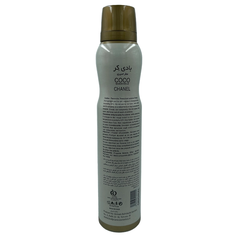 اسپری بدن زنانه کوکو مادمازل چنل بادی کر ۲۰۰ میلی لیتر محصولی لوکس و باکیفیت از برند معتبر بادی کر (Body Care) است که با الهام از عطر معروف کوکو مادمازل از برند چنل طراحی شده است. این اسپری بدن با رایحه‌ای تازه، گلی و مرکباتی، ترکیبی از ظرافت و جذابیت را به بانوان ارائه می‌دهد و حس سرزندگی و اعتماد به نفس را تقویت می‌کند. اسپری بدن زنانه کوکو مادمازل چنل بادی کر با فرمولاسیونی ملایم و غیرتحریک‌کننده، برای انواع پوست، از جمله پوست‌های حساس، مناسب بوده و به عنوان یک محصول خوشبوکننده و مرطوب‌کننده برای استفاده روزانه ایده‌آل است.