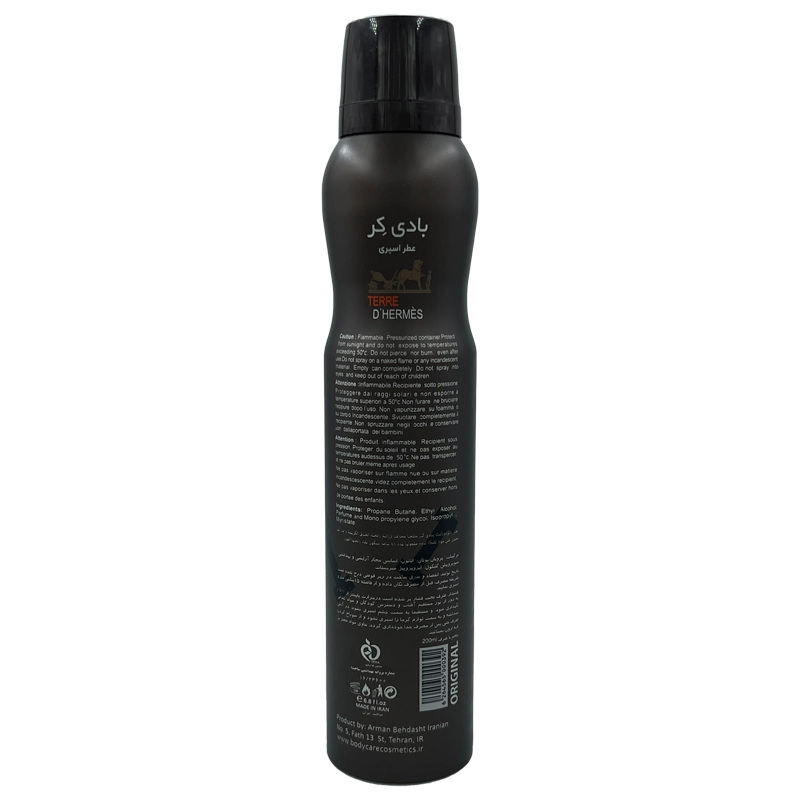 اسپری بدن مردانه تق هرمس بادی کر 200 میلی لیتر یکی از محصولات خوشبوکننده و لوکس برند بادی کر (Body Care) است که با الهام از عطر معروف و محبوب تق هرمس (Terre d’Hermes) طراحی شده و با رایحه‌ای تلخ، تند و چوبی، حس مردانگی، قدرت و اعتماد به نفس را به آقایان هدیه می‌دهد.
