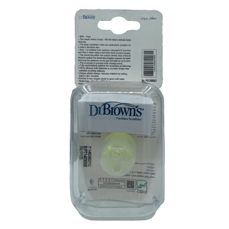سوراخ‌های تهویه هوشمند در پستانک دکتر براون، جریان هوای مناسب را فراهم کرده و از تجمع بزاق، رطوبت و تحریک پوست دور دهان جلوگیری می‌کند. رنگ زرد شفاف و جذاب این پستانک دکتر براون، توجه بصری نوزاد را جلب کرده و حس شادی و آرامش را القا می‌کند. پستانک دکتر براون با بسته‌بندی ضدباکتری و بهداشتی، از لحظه تولید تا مصرف، ایمنی کامل را تضمین می‌نماید.