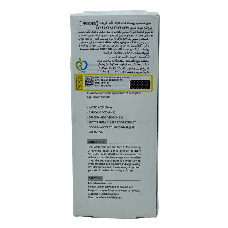 سرم ضد لک فریدن ۳۰ میلی‌لیتر یکی از محصولات تخصصی مراقبت از پوست است که با هدف کاهش و رفع لک‌های تیره، جای جوش، کک و مک و تیرگی‌های ناشی از تابش آفتاب تولید شده است.