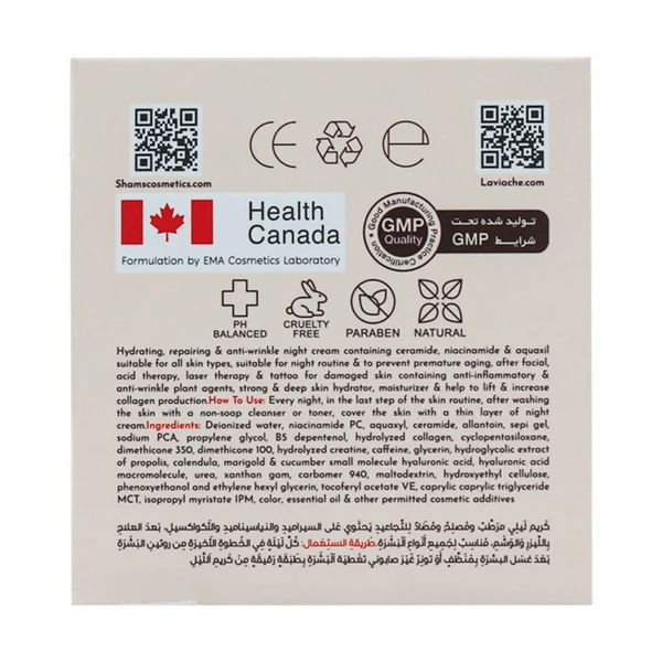 ترکیبات کرم. شب لاویاچه با دقت بالا و بر اساس نیازهای پوست در طول شب انتخاب شده‌اند. این کرم حاوی مجموعه‌ای از مواد آبرسان، تغذیه‌کننده و ترمیم‌کننده است که به بازسازی پوست کمک می‌کنند.
