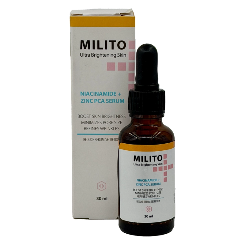 • زینک پی‌سی‌ای (Zinc PCA): زینک یک ماده معدنی ضروری برای پوست است که در این سرم به شکل پی‌سی‌ای (پیروگلوتامیک اسید) استفاده شده است تا جذب بهتری داشته باشد. زینک پی‌سی‌ای در سرم روشن کننده پوست حاوی نیاسین آمید و زینک میلیتو ۳۰ میلی لیتر نقش مکمل نیاسین‌آمید را ایفا می‌کند. این ماده به شدت در کنترل ترشح سبوم موثر است و به همین دلیل برای پوست‌های چرب و مستعد آکنه عالی است. زینک همچنین دارای خواص ضد میکروبی است که با باکتری‌های مولد آکنه مبارزه می‌کند. از نظر زیبایی‌شناسی، زینک به کاهش قرمزی و تحریک پوست کمک می‌کند و ظاهری مات به پوست می‌بخشد. ترکیب زینک با نیاسین‌آمید، یک سینرژی قدرتمند ایجاد می‌کند که هم چربی را کنترل می‌کند و هم رنگ پوست را روشن می‌کند.