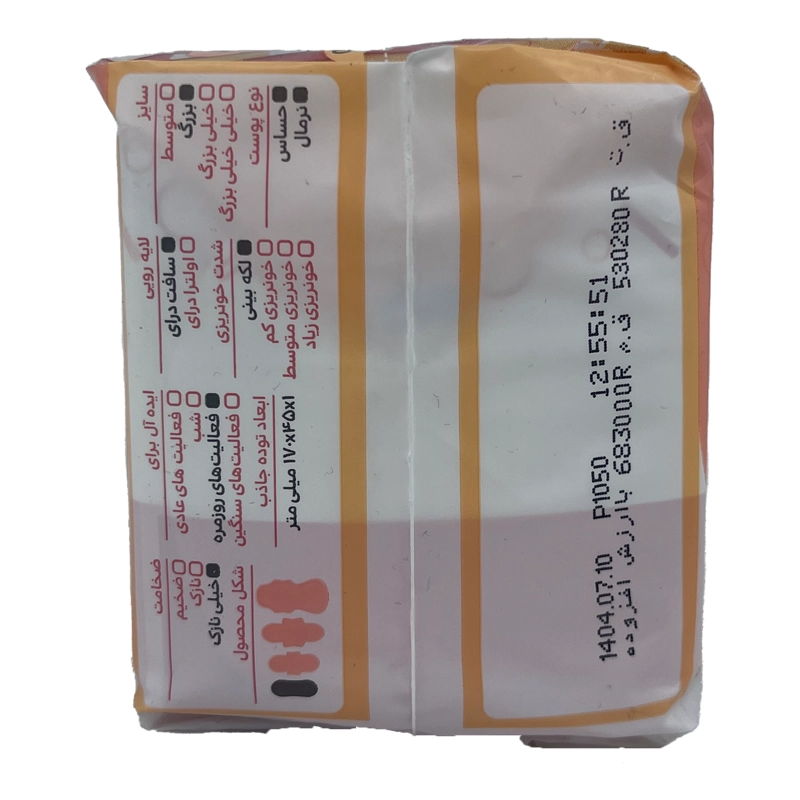 • سایز بزرگ و پوشش‌دهی کامل: طراحی سایز بزرگ این پد، نواحی بیشتری را پوشش می‌دهد و از نشت مایع به لباس جلوگیری می‌کند. این ویژگی باعث می‌شود کاربر در طول روز احساس راحتی و امنیت بیشتری داشته باشد.