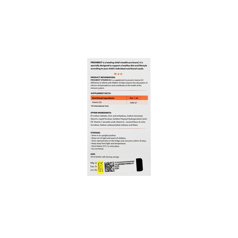 اثربخشی این قطره پدیا د۳ ناشی از ترکیبات دقیق و باکیفیت آن است. در هر یک میلیلیتر از این محصول، مواد زیر یافت میشود: