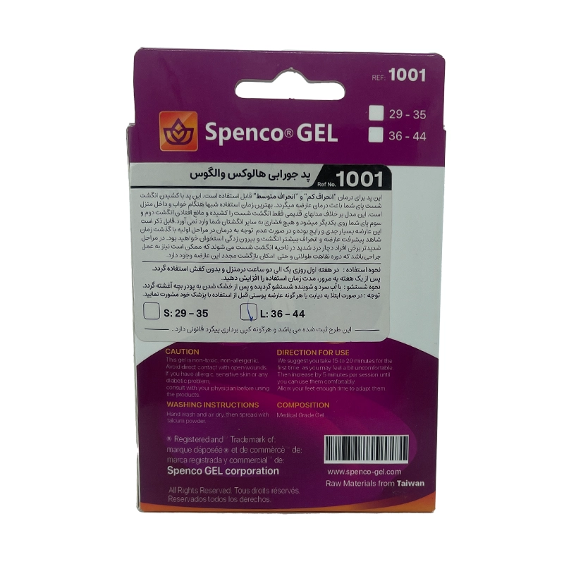 این محصول، یک ابزار کاملاً حرفهای و پیشرفته است که با تکنولوژی ژل سیلیکونی نرم و ارتجاعی طراحی شده و با قرار گرفتن روی انگشت شست، فضای مناسب بین انگشتها ایجاد میکند تا از برخورد انگشت شست با انگشتان کناری جلوگیری شود. بسیاری از افراد مبتلا به این عارضه تنها زمانی متوجه اهمیت استفاده از پد جورابی هالوکس والگوس اسپنکو ژل میشوند که در طول روز دچار دردهای تیرکشنده و ناراحتی در انگشت شست میشوند. این محصول به کمک طراحی جورابیشکل، در طول روز ثابت میماند و برخلاف پدهای معمولی، سر نمیخورد یا از انگشت جدا نمیشود.
