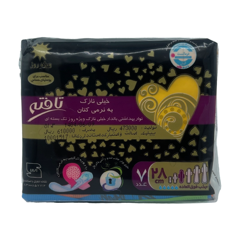 تافتـه سالهاست که در حوزه بهداشت بانوان فعالیت میکند و محصولات آن به دلیل کیفیت بالا، تنوع، سازگاری با پوست و قیمت مناسب، در میان مصرفکنندگان ایرانی شناخته شده است. این نوار نیز یکی از محصولات کاربردی این برند است که برای «مصرف روزانه در زمان خونریزی کم تا متوسط» طراحی شده و بستهبندی ۷ عددی آن بهراحتی قابل حمل، نگهداری و استفاده است.